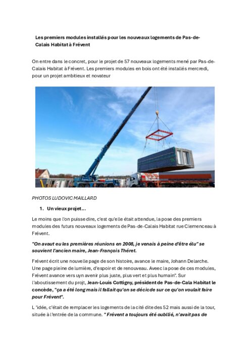 Institutionnels, Services 18 novembre 2025 - 12:50 On entre dans le concret, pour le projet de 57 nouveaux logements mené par Pas-de-Calais Habitat à Frévent. Les premiers modules en bois ont été installés mercredi, pour un projet ambitieux et novateur. PDF (280 Ko) Télécharger