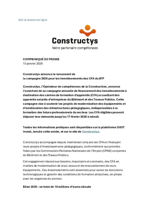 Constructys, l’Opérateur de compétences de la Construction, annonce l’ouverture de sa campagne annuelle de financement des investissements à destination des centres de formation d’apprentis (CFA) accueillant des apprentis salariés d’entreprises du Bâtiment et des Travaux Publics. Cette campagne vise à soutenir les projets de modernisation des équipements et d’amélioration des infrastructures pédagogiques, indispensables à la formation des futurs professionnels du secteur. Les CFA éligibles peuvent déposer leur demande jusqu’au 17 février 2026 à minuit.