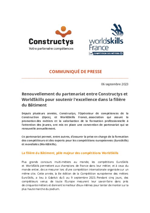 Depuis plusieurs années, Constructys, l'Opérateur de compétences de la Construction (Opco), et WorldSkills France, association qui assure la promotion des métiers et la valorisation de la formation professionnelle à l’attention des jeunes, ont mis en place une convention de partenariat qui se renouvelle annuellement. Ce partenariat permet, entre autres, d'assurer la prise en charge de la formation des compétiteurs et des experts pour les compétitions européennes (EuroSkills) et mondiales (WorldSkills).