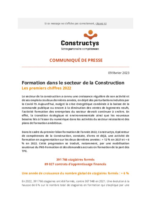 Dans le cadre du premier bilan formation de l’année 2022, Constructys, opérateur de compétences de la construction, constate, d'ores et déjà, une activité de formation en augmentation sur les deux dernières années : +12 % en 2021 et +6 % en 2022. Cette progression se traduit, notamment, par une mobilisation soutenue du FNE-Formation et des demandes accrues en formation de la part des TPE.