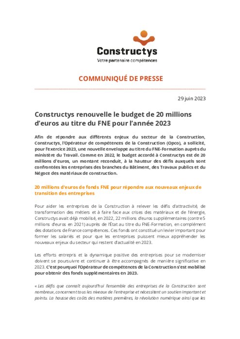 Afin de répondre aux différents enjeux du secteur de la Construction, Constructys, l’Opérateur de compétences de la Construction (Opco), a sollicité, pour l’exercice 2023, une nouvelle enveloppe au titre du FNE-Formation auprès du ministère du Travail. Comme en 2022, le budget accordé à Constructys est de 20 millions d'euros, un montant reconduit, à la hauteur des défis auxquels sont confrontées les entreprises des branches du Bâtiment, des Travaux publics et du Négoce des matériaux.