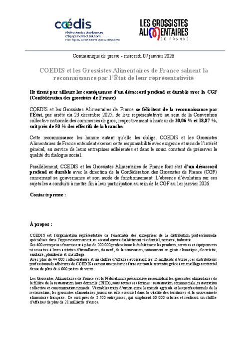 COÉDIS et les Grossistes Alimentaires de France se félicitent de la reconnaissance par l’État, par arrêté du 23 décembre 2025, de leur représentativité au sein de la Convention collective nationale des commerces de gros, respectivement à hauteur de 30,06 % et 18,87 %, soit près de 50 % des effectifs de la branche.
