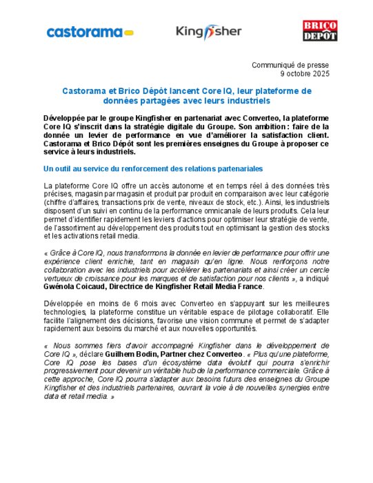 Développée par le groupe Kingfisher en partenariat avec Converteo, la plateforme Core IQ s’inscrit dans la stratégie digitale du Groupe. Son ambition : faire de la donnée un levier de performance en vue d’améliorer la satisfaction client. Castorama et Brico Dépôt sont les premières enseignes du Groupe à proposer ce service à leurs industriels.