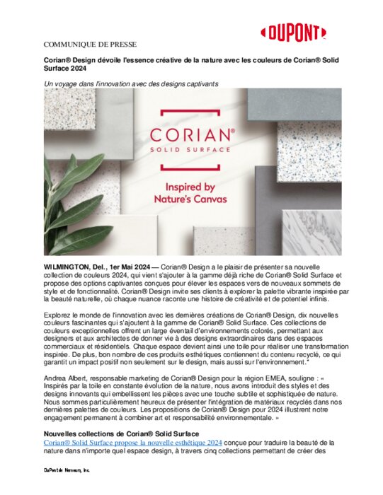 Corian Design a le plaisir de présenter sa nouvelle collection de couleurs 2024, qui vient s'ajouter à la gamme déjà riche de Corian Solid Surface et propose des options captivantes conçues pour élever les espaces vers de nouveaux sommets de style et de fonctionnalité. Corian Design invite ses clients à explorer la palette vibrante inspirée par la beauté naturelle, où chaque nuance raconte une histoire de créativité et de potentiel infinis.