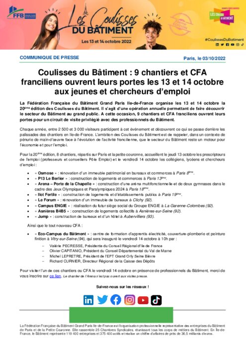 La Fédération Française du Bâtiment Grand Paris Ile-de-France organise les 13 et 14 octobre la 20e édition des Coulisses du Bâtiment. Il s’agit d’une opération annuelle permettant de faire découvrir le secteur du Bâtiment au grand public. A cette occasion, 9 chantiers et CFA franciliens ouvrent leurs portes pour un circuit de visite privilégié avec des professionnels du Bâtiment.