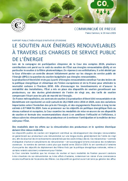 Lors de la campagne de participation citoyenne de la Cour des comptes 2024, plusieurs contributions ont porté sur le coût du soutien de l’État aux énergies renouvelables (EnR), et en particulier le soutien à la filière photovoltaïque. En réponse à ces sollicitations, il a été décidé par la Cour d’étendre un contrôle devant initialement porter sur les charges de service public de l’énergie (SPE) à la question du soutien budgétaire aux énergies renouvelables.