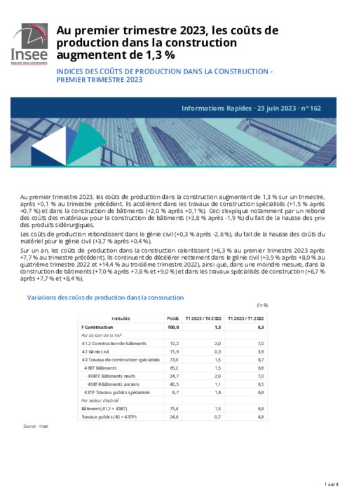 Au premier trimestre 2023, les coûts de production dans la construction augmentent de +1,3 % sur un trimestre, après +0,1 % au trimestre précédent. Ils accélèrent dans les travaux de construction spécialisés (+1,5 % après +0,7 %) et dans la construction de bâtiments (+2 % après +0,1 %). Ceci s’explique notamment par un rebond des coûts des matériaux pour la construction de bâtiments (+3,8 % après -1,9 %) du fait de la hausse des prix des produits sidérurgiques.