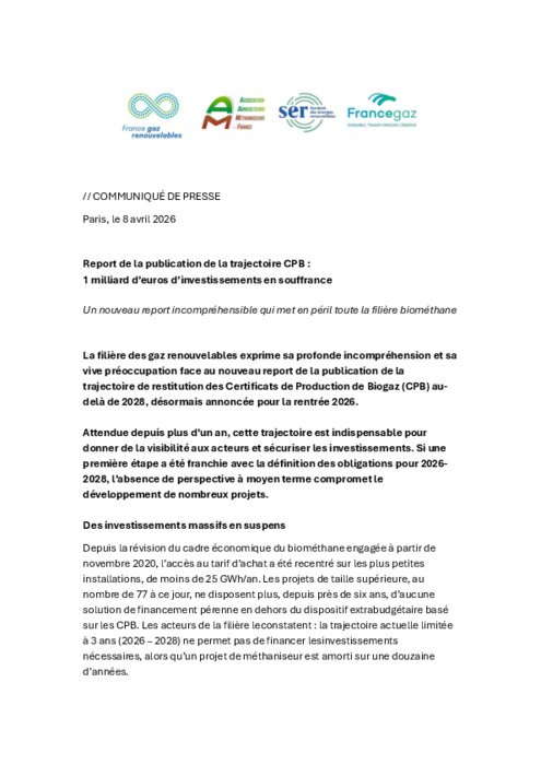 La filière des gaz renouvelables exprime sa profonde incompréhension et sa vive préoccupation face au nouveau report de la publication de la trajectoire de restitution des Certificats de Production de Biogaz (CPB) au-delà de 2028, désormais annoncée pour la rentrée 2026.