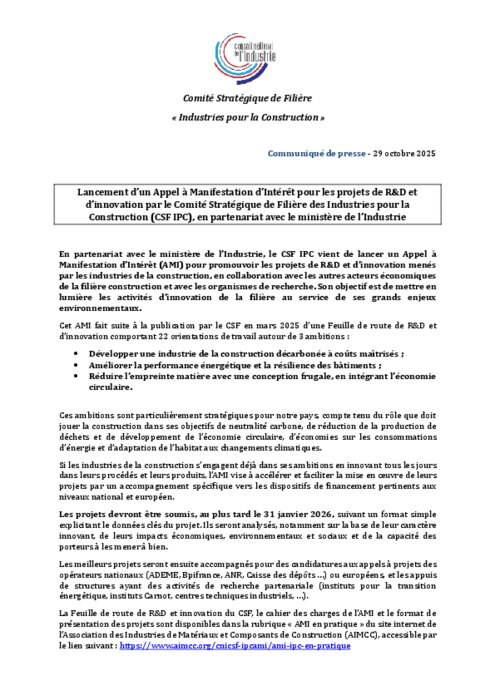 En partenariat avec le ministère de l’Industrie, le CSF IPC vient de lancer un Appel à Manifestation d’Intérêt (AMI) pour promouvoir les projets de R et D et d’innovation menés par les industries de la construction, en collaboration avec les autres acteurs économiques de la filière construction et avec les organismes de recherche. Son objectif est de mettre en lumière les activités d’innovation de la filière au service de ses grands enjeux environnementaux.