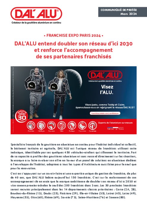 C’est en s’appuyant sur un savoir-faire et une expertise unique de gestion de franchise, de plus de 40 ans, que DAL’ALU fédère aujourd’hui 150 franchisés. C’est sur le renforcement de son accompagnement clé en main que la marque ambitionne de doubler son réseau d’ici à 2030 et vise comme premier échelon le seuil des 200 franchisés dans 3 ans. Les 50 prochains franchisés seront recrutés principalement dans les 14 départements classés prioritaires : Corse (2A, 2B), Bouches-du-Rhône (13), Doubs (25), Finistère (29), Ille-et-Vilaine (35), Loiret (45), Loire (49), Mayenne (53), Oise (60), Rhône (69), Savoie (73), Seine-Maritime (76) et Somme (80).