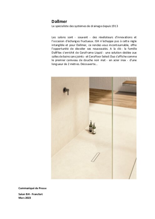 Industriels 17 mars 2023 - 09:46 La famille DallFlex s’enrichit de CeraFrame Liquid - une solution dédiée aux salles de bains sans joints- et CeraFloor Select Duo s’affiche comme le premier caniveau de douche noir mat - en acier inox - d’une longueur de 2 mètres. PDF (524 Ko) Télécharger