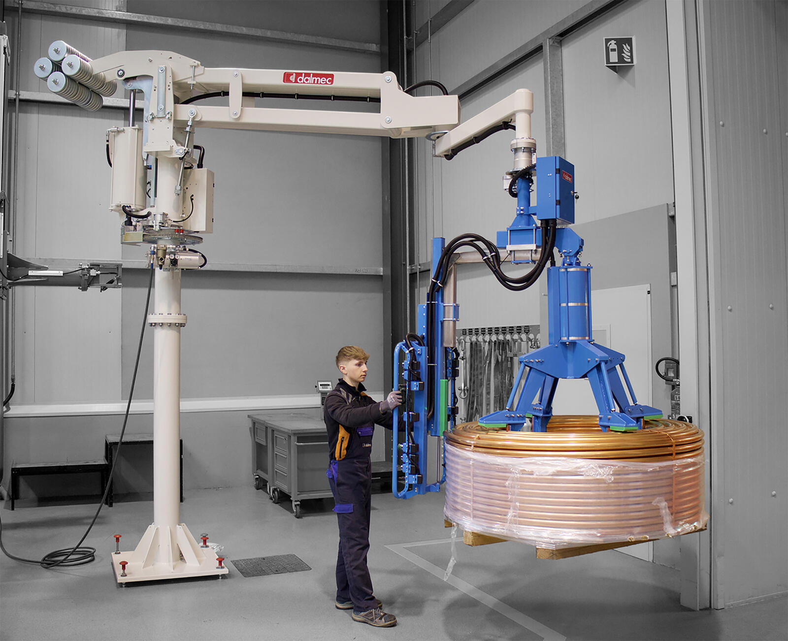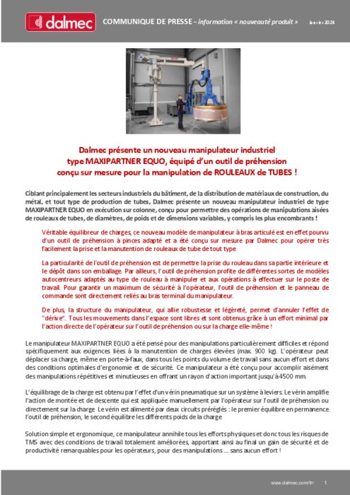 Ciblant principalement les secteurs industriels du bâtiment, de la distribution de matériaux de construction, du métal, et tout type de production de tubes, Dalmec présente un nouveau manipulateur industriel de type Maxipartner Equo en exécution sur colonne, conçu pour permettre des opérations de manipulations aisées de rouleaux de tubes, de diamètres, de poids et de dimensions variables, y compris les plus encombrants.
