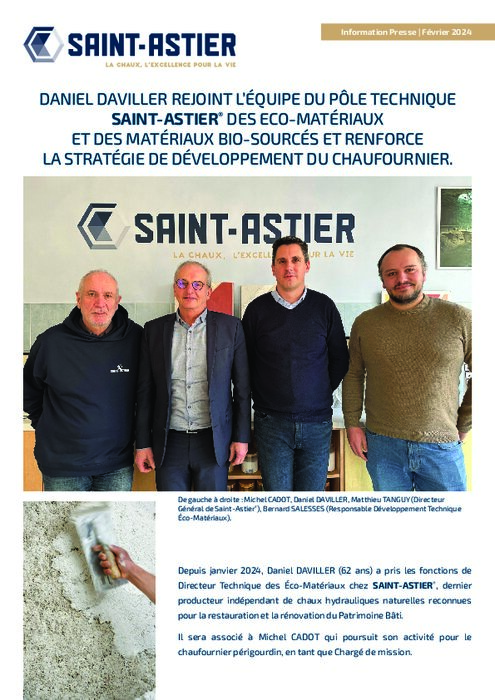 Depuis janvier 2024, Daniel DAVILLER (62 ans) a pris les fonctions de Directeur Technique des Éco-Matériaux chez SAINT-ASTIER, dernier producteur indépendant de chaux hydrauliques naturelles reconnues pour la restauration et la rénovation du Patrimoine Bâti. Il sera associé à Michel CADOT qui poursuit son activité pour le chaufournier périgourdin, en tant que Chargé de mission.