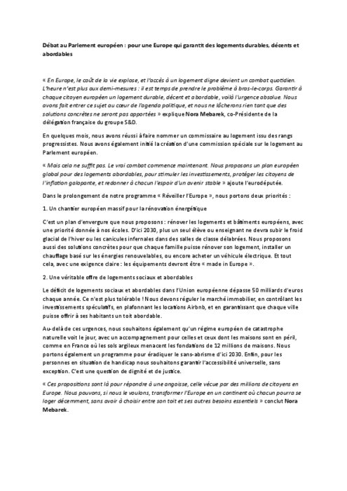 « En Europe, le coût de la vie explose, et l'accès à un logement digne devient un combat quotidien. L'heure n'est plus aux demi-mesures : il est temps de prendre le problème à bras-le-corps. Garantir à chaque citoyen européen un logement durable, décent et abordable, voilà l’urgence absolue. Nous avons fait entrer ce sujet au cœur de l’agenda politique, et nous ne lâcherons rien tant que des solutions concrètes ne seront pas apportées » explique Nora Mebarek, co-Présidente de la délégation française du groupe S&D.