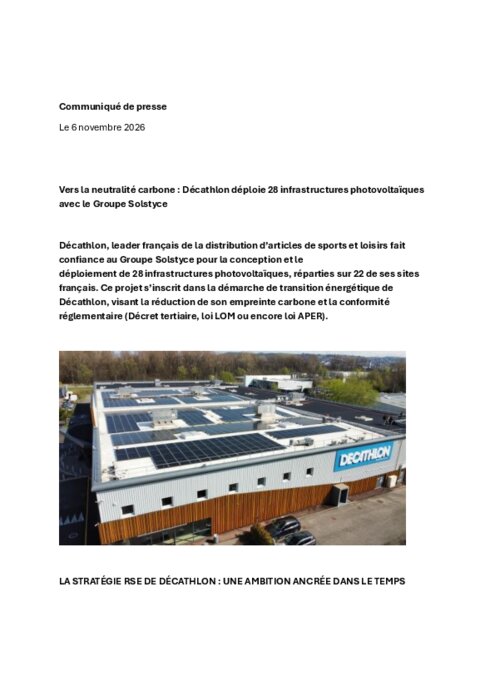 Décathlon, leader français de la distribution d’articles de sports et loisirs fait confiance au Groupe Solstyce pour la conception et le déploiement de 28 infrastructures photovoltaïques, réparties sur 22 de ses sites français. Ce projet s’inscrit dans la démarche de transition énergétique de Décathlon, visant la réduction de son empreinte carbone et la conformité réglementaire (Décret tertiaire, loi LOM ou encore loi APER).