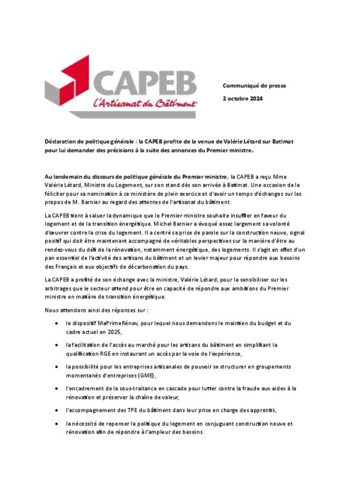 Institutionnels 02 octobre 2024 - 12:23 La CAPEB a profité de son échange avec la ministre, Valérie Létard, pour la sensibiliser sur les arbitrages que le secteur attend pour être en capacité de répondre aux ambitions du Premier ministre en matière de transition énergétique. PDF (439 Ko) Télécharger Crédits : Capeb