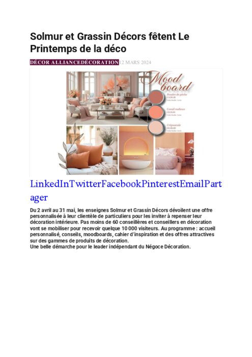 Du 2 avril au 31 mai, les enseignes Solmur et Grassin Décors dévoilent une offre personnalisée à leur clientèle de particuliers pour les inviter à repenser leur décoration intérieure. Pas moins de 60 conseillères et conseillers en décoration vont se mobiliser pour recevoir quelque 10 000 visiteurs. Au programme : accueil personnalisé, conseils, moodboards, cahier d’inspiration et des offres attractives sur des gammes de produits de décoration.