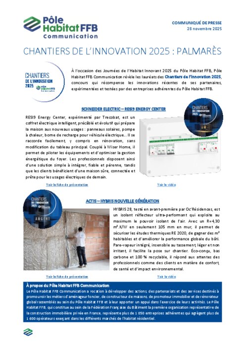 À l’occasion des Journées de l’Habitat Innovant 2025 du Pôle Habitat FFB, Pôle Habitat FFB Communication révèle les lauréats des Chantiers de l’Innovation 2025, concours qui récompense les innovations récentes de ses partenaires, expérimentées et testées par des entreprises adhérentes du Pôle Habitat FFB.