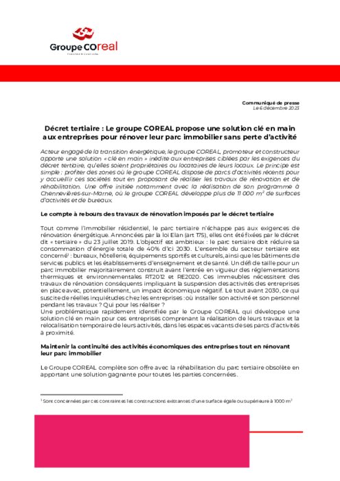 Acteur engagé de la transition énergétique, le groupe COREAL, promoteur et constructeur apporte une solution « clé en main » inédite aux entreprises ciblées par les exigences du décret tertiaire, qu’elles soient propriétaires ou locataires de leurs locaux.