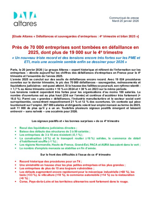 L’année 2025 se conclut sur des seuils de défaillances encore record. Avec 19 024 procédures ouvertes sur le dernier trimestre, le pic des 70 000 défaillances - sauvegardes, redressements et liquidations judiciaires - est quasi atteint. Si la hausse des faillites se poursuit, son rythme ralentit : + 1,7 % au 4ème trimestre contre + 10 % en 2024 et + 38 % en 2023 sur la même période.