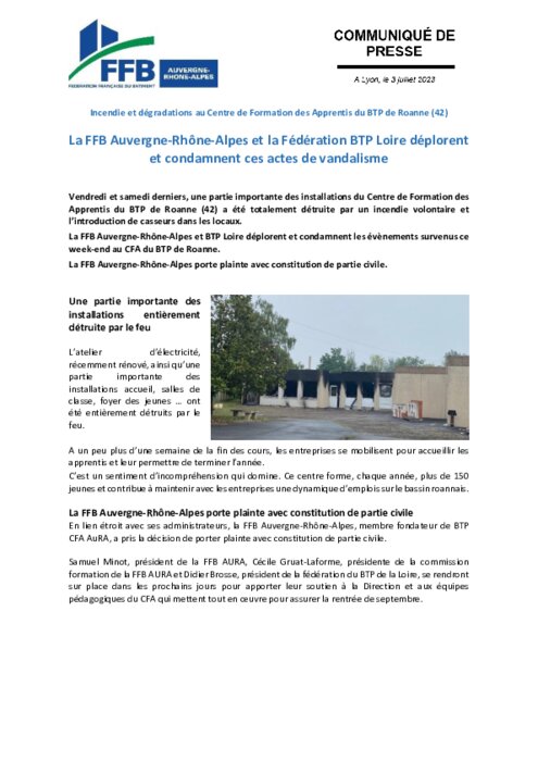 Vendredi et samedi derniers, une partie importante des installations du Centre de Formation des Apprentis du BTP de Roanne (42) a été totalement détruite par un incendie volontaire et l’introduction de casseurs dans les locaux. La FFB Auvergne-Rhône-Alpes et BTP Loire déplorent et condamnent les évènements survenus ce week-end au CFA du BTP de Roanne. La FFB Auvergne-Rhône-Alpes porte plainte avec constitution de partie civile.