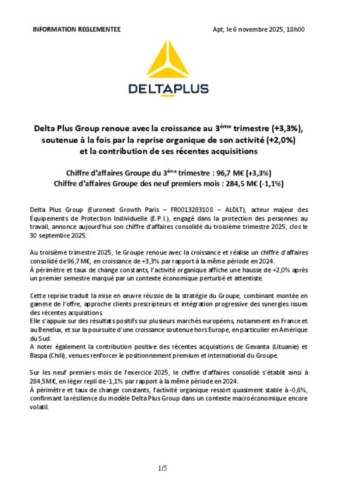 Industriels 07 novembre 2025 - 06:36 Cette reprise traduit la mise en œuvre réussie de la stratégie du Groupe, combinant montée en gamme de l’offre, approche clients prescripteurs et intégration progressive des synergies issues des récentes acquisitions. PDF (243 Ko) Télécharger credit Delta Plus