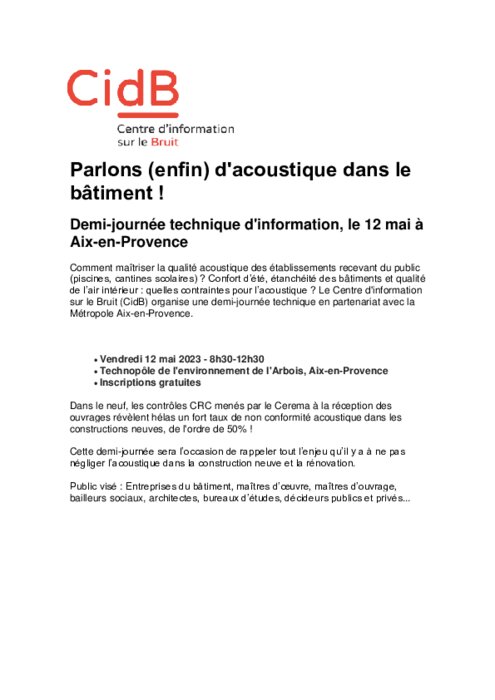 Comment maîtriser la qualité acoustique des établissements recevant du public (piscines, cantines scolaires) ? Confort d’été, étanchéité des bâtiments et qualité de l’air intérieur : quelles contraintes pour l’acoustique ? Le Centre d'information sur le Bruit (CidB) organise une demi-journée technique en partenariat avec la Métropole Aix-en-Provence.