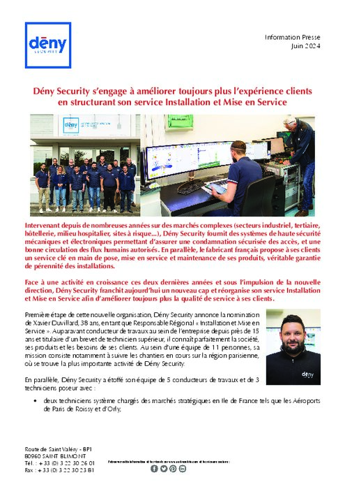 Face à une activité en croissance ces deux dernières années et sous l’impulsion de la nouvelle direction, Dény Security franchit aujourd’hui un nouveau cap et réorganise son service Installation et Mise en Service afin d’améliorer toujours plus la qualité de service à ses clients.
