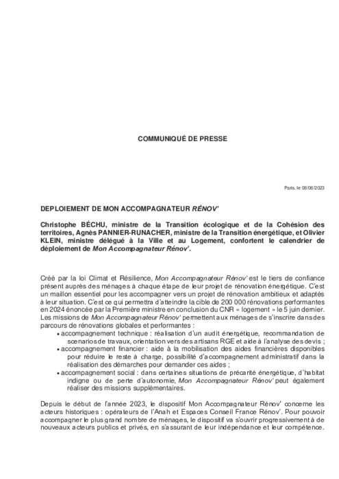 Christophe Béchu, ministre de la Transition écologique et de la Cohésion des territoires, Agnès Pannier-Runacher, ministre de la Transition énergétique, et Olivier Klein, ministre délégué à la Ville et au Logement, précisent le calendrier de déploiement de Mon Accompagnateur Rénov’.