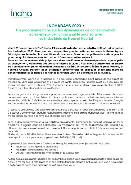 Jeudi 23 novembre, à la BNF, Inoha, l’Association des Industriels du Nouvel Habitat, organise les Inohadays 2023. Une journée prospective placée cette année sous la thématique « Stratégie omnicanale : les conditions du succès ». Comment appréhender cette approche pour conquérir de nouveaux territoires ? Quels en sont les enjeux ?