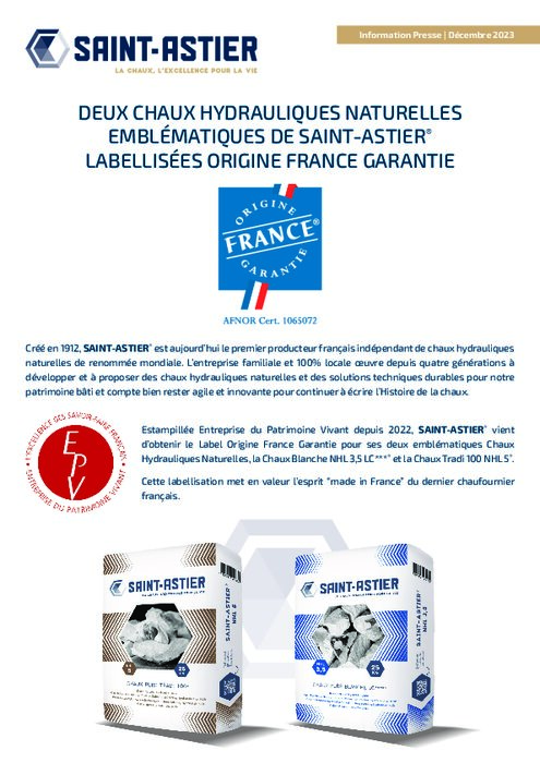Estampillée Entreprise du Patrimoine Vivant depuis 2022, SAINT-ASTIER vient d’obtenir le Label Origine France Garantie pour ses deux emblématiques Chaux Hydrauliques Naturelles, la Chaux Blanche NHL 3,5 LC*** et la Chaux Tradi 100 NHL 5. Cette labellisation met en valeur l’esprit “made in France” du dernier chaufournier français.