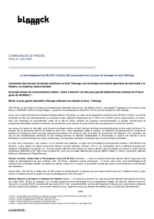 Lancement des travaux de façade extérieure en bois Yakisugi, une technique ancestrale japonaise de bois traité à la flamme, un matériau naturel durable. Un projet acteur du renouvellement urbain, visant à devenir l’un des plus grands bâtiments bas carbone de France (près de 48 000m2).Black, le plus grand immeuble d’Europe arborant une façade en bois Yakisugi