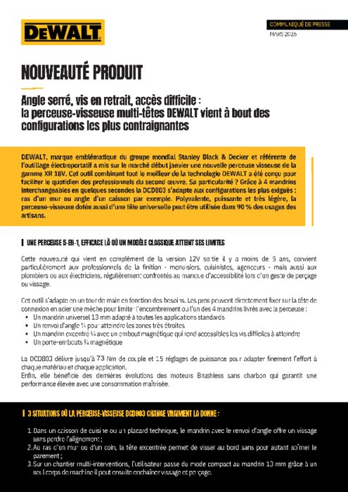 DEWALT, marque emblématique du groupe mondial Stanley Black & Decker et référente de l'outillage électroportatif a mis sur le marché début janvier une nouvelle perceuse visseuse de la gamme XR 18V. Cet outil combinant tout le meilleur de la technologie DEWALT a été conçu pour faciliter le quotidien des professionnels du second œuvre. Sa particularité ? Grâce à 4 mandrins interchangeables en quelques secondes la DCD803 s'adapte aux configurations les plus exiguës : ras d'un mur ou angle d'un caisson par exemple. Polyvalente, puissante et très légère, la perceuse-visseuse dotée aussi d'une tête universelle peut être utilisée dans 90 % des usages des artisans.