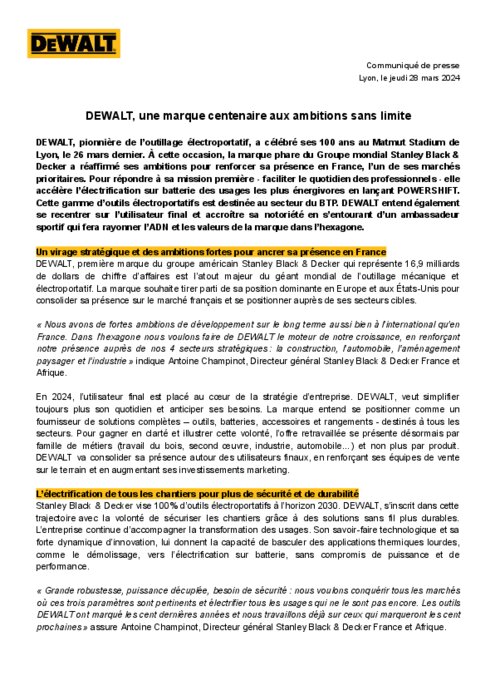 Dewalt, pionnière de l’outillage électroportatif, a célébré ses 100 ans au Matmut Stadium de Lyon, le 26 mars dernier. À cette occasion, la marque phare du Groupe mondial Stanley Black & Decker a réaffirmé ses ambitions pour renforcer sa présence en France, l’un de ses marchés prioritaires.