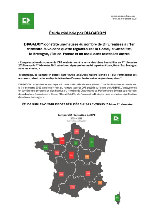 DIAGADOM, acteur leader du diagnostic immobilier, dévoile les résultats d’une étude exclusive menée sur le 1er trimestre 2025 avec les chiffres du nombre total de DPE publiés sur le site de l’ADEME. L’analyse met en lumière une progression significative du nombre de Diagnostics de Performance Énergétique réalisés dans 4 régions françaises : la Corse, l’Grand Est, l'Île-de-France et la Bretagne mais une baisse significative dans les autres régions.