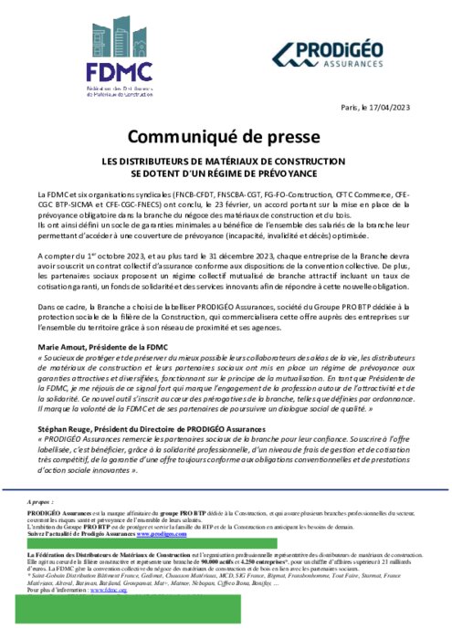 La FDMC et six organisations syndicales (FNCB-CFDT, FNSCBA-CGT, FG-FO-Construction, CFTC Commerce, CFE-CGC BTP-SICMA et CFE-CGC-FNECS) ont conclu, le 23 février, un accord portant sur la mise en place de la prévoyance obligatoire dans la branche du négoce des matériaux de construction et du bois. Ils ont ainsi défini un socle de garanties minimales au bénéfice de l’ensemble des salariés de la branche leur permettant d’accéder à une couverture de prévoyance.