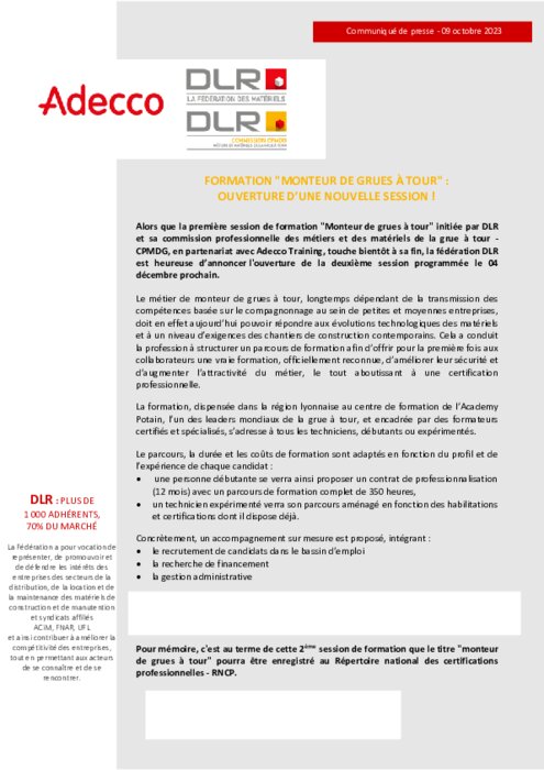 Alors que la première session de formation "Monteur de grues à tour" initiée par DLR et sa commission professionnelle des métiers et des matériels de la grue à tour - CPMDG, en partenariat avec Adecco Training, touche bientôt à sa fin, la fédération DLR est heureuse d’annoncer l'ouverture de la deuxième session programmée le 04 décembre prochain.