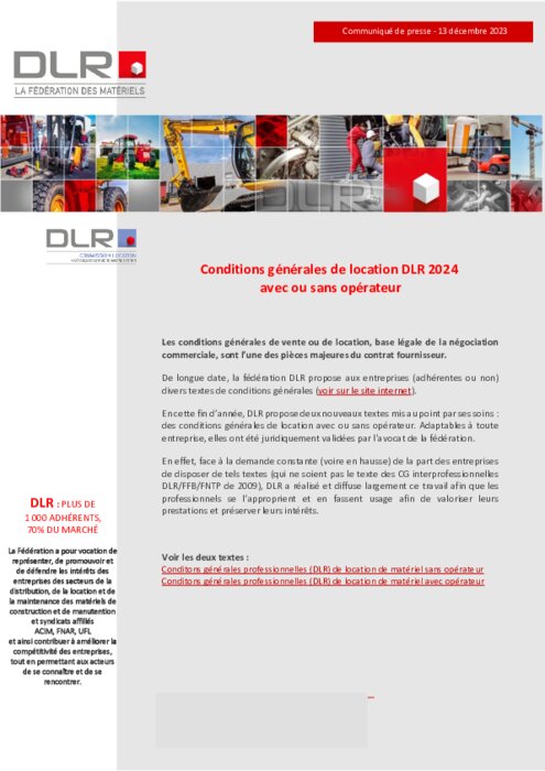 Institutionnels 13 décembre 2023 - 14:52 En cette fin d’année, DLR propose deux nouveaux textes mis au point par ses soins : des conditions générales de location avec ou sans opérateur. Adaptables à toute entreprise, elles ont été juridiquement validées par l'avocat de la fédération. PDF (282 Ko) Télécharger