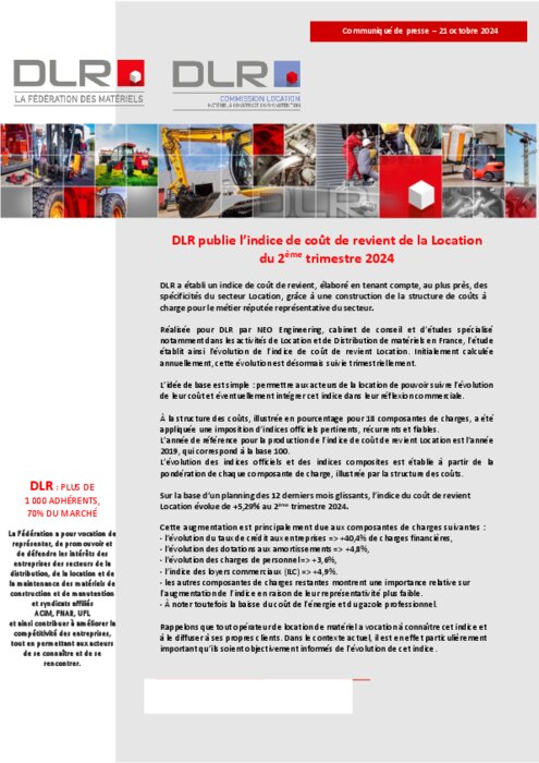 Institutionnels 21 octobre 2024 - 16:43 DLR a établi un indice de coût de revient, élaboré en tenant compte, au plus près, des spécificités du secteur Location, grâce à une construction de la structure de coûts à charge pour le métier réputée représentative du secteur. PDF (300 Ko) Télécharger
