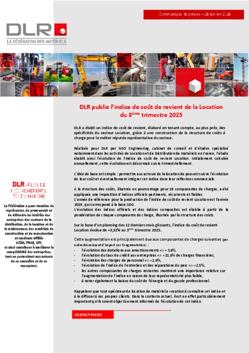 Réalisée pour DLR par NEO Engineering, cabinet de conseil et d’études spécialisé notamment dans les activités de location et de distribution de matériels en France, l’étude établit ainsi l’évolution de l’indice de coût de revient location. Initialement calculée annuellement, cette évolution est désormais suivie trimestriellement.