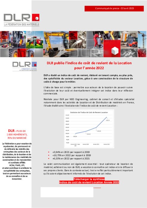 DLR a établi un indice de coût de revient, élaboré en tenant compte, au plus près, des spécificités du secteur Location, grâce à une construction de la structure de coûts à charge pour le métier. L’idée de base est simple : permettre aux acteurs de la location de pouvoir suivre l’évolution de leur coût et éventuellement intégrer cet indice dans leur réflexion commerciale.