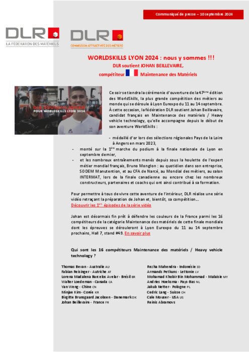 Institutionnels 10 septembre 2024 - 10:03 Pour permettre à tous de vivre cette aventure de l’intérieur, DLR réalise une série vidéo retraçant la préparation de Johan et, bientôt, sa compétition... PDF (395 Ko) Télécharger