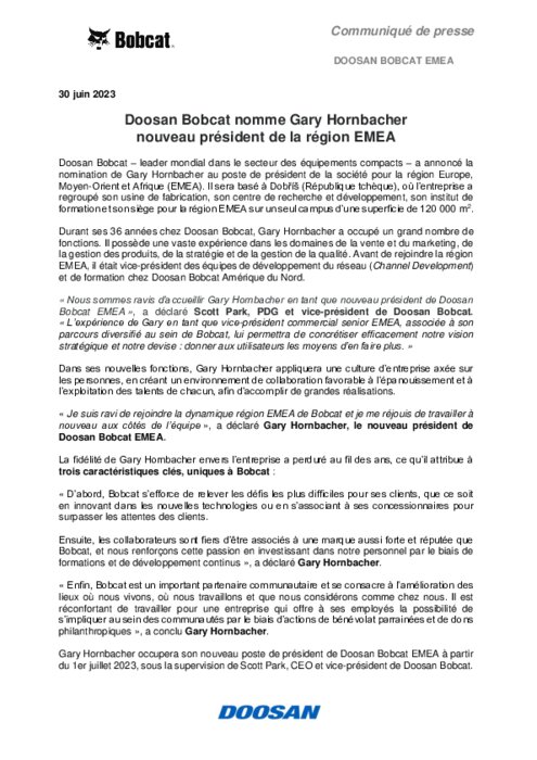 Doosan Bobcat – leader mondial dans le secteur des équipements compacts – a annoncé la nomination de Gary Hornbacher au poste de président de la société pour la région Europe, Moyen-Orient et Afrique (EMEA). Il sera basé à Dobříš (République tchèque), où l’entreprise a regroupé son usine de fabrication, son centre de recherche et développement, son institut de formation et son siège pour la région EMEA sur un seul campus d’une superficie de 120 000 m
