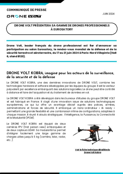 Drone Volt, leader français du drone professionnel est fier d’annoncer sa participation au salon Eurosatory, le rendez-vous mondial de la défense et de la sécurité terrestre et aéroterrestre, du 17 au 21 juin 2024 à Paris-Nord Villepinte (Hall