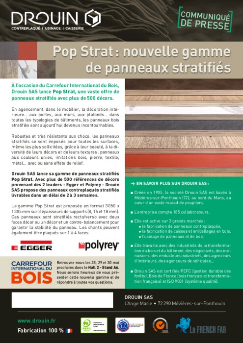 Industriels 23 mai 2024 - 10:10 Drouin SAS lance sa gamme de panneaux stratifiés Pop Strat. Avec plus de 500 références de décors provenant des 2 leaders - Egger et Polyrey - Drouin SAS propose des panneaux contreplaqués stratifiés livrables dans un délai de 2 à 3 semaines. PDF (449 Ko) Télécharger