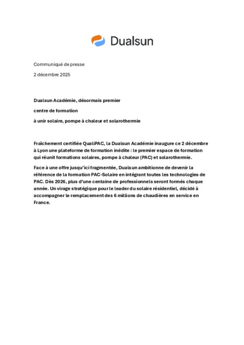 Fraîchement certifiée QualiPAC, la Dualsun Académie inaugure ce 2 décembre à Lyon une plateforme de formation inédite : le premier espace de formation qui réunit formations solaires, pompe à chaleur (PAC) et solarothermie.