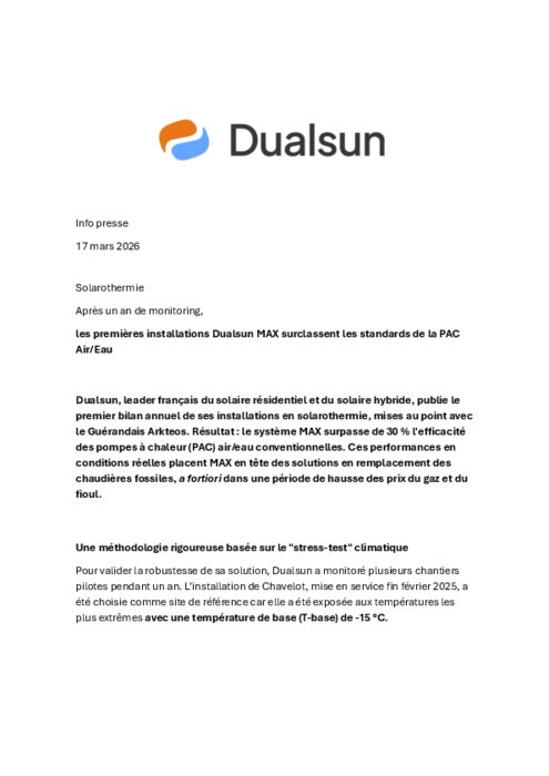 Dualsun, leader français du solaire résidentiel et du solaire hybride, publie le premier bilan annuel de ses installations en solarothermie, mises au point avec le Guérandais Arkteos. Résultat : le système MAX surpasse de 30 % l'efficacité des pompes à chaleur (PAC) air/eau conventionnelles. Ces performances en conditions réelles placent MAX en tête des solutions en remplacement des chaudières fossiles, a fortiori dans une période de hausse des prix du gaz et du fioul.
