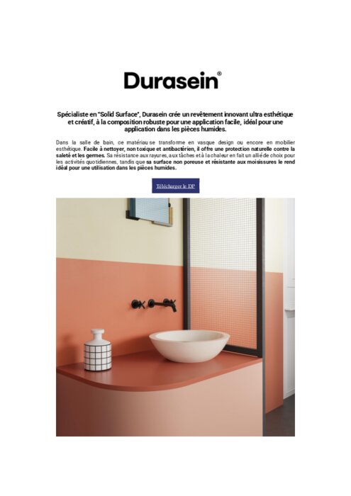 Industriels 30 mai 2024 - 13:58 Spécialiste en ''Solid Surface'', Durasein crée un revêtement innovant ultra esthétique et créatif, à la composition robuste pour une application facile, idéal pour une application dans les pièces humides. PDF (481 Ko) Télécharger