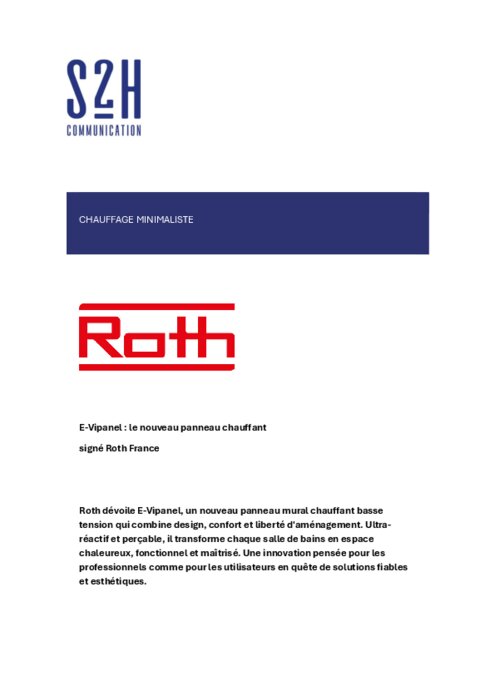 Roth dévoile E-Vipanel, un nouveau panneau mural chauffant basse tension qui combine design, confort et liberté d'aménagement. Ultra-réactif et perçable, il transforme chaque salle de bains en espace chaleureux, fonctionnel et maîtrisé. Une innovation pensée pour les professionnels comme pour les utilisateurs en quête de solutions fiables et esthétiques.