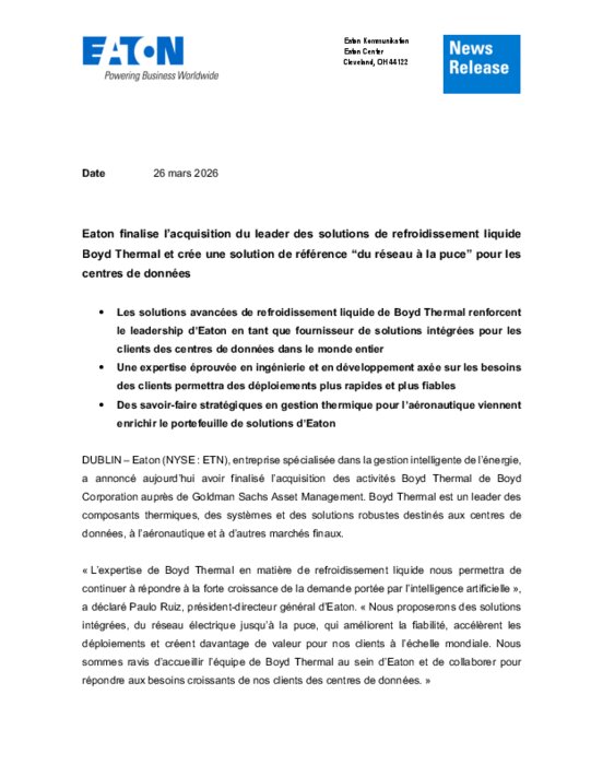 Eaton, spécialiste mondial de la gestion intelligente de l’énergie, finalise l’acquisition de Boyd Thermal, acteur international du refroidissement liquide comptant plus de 6 000 employés et des sites en Amérique du Nord, en Europe et en Asie. Cette opération stratégique renforce son positionnement sur le marché des data centers, en forte croissance.